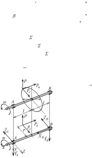 Пример 8.11. На горизонтальном валу жестко закреплено зубчатое колесо. Левый конец вала опирается на подшипник, а правый - на подпятник. На колесо действуют три силы: касательная (окружное усилие) P = 4200 H; радиальная (направлена к оси вала) РR = 1550 H; осевая (параллельно оси вала) Ра = 760 H. Колесо рас-