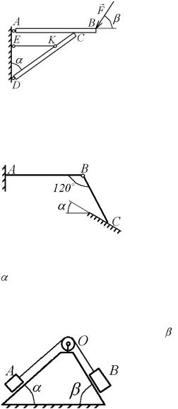 = 60 , закреплена в точке D при помощи неподвижного цилиндрического шарнира и удерживается в равновесии при помощи горизонтальной веревки ЕК, причем DE= 2 м. В точке В к балке приложена сила F =1200 Н, наклоненная к балке под