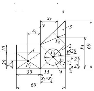 F1 = 20 30 = 600 см2, F2 = 30 30 = 900 см2, F3 = 0,5 30 30 = 450 см2, F4 = - r2 = -314 см2.