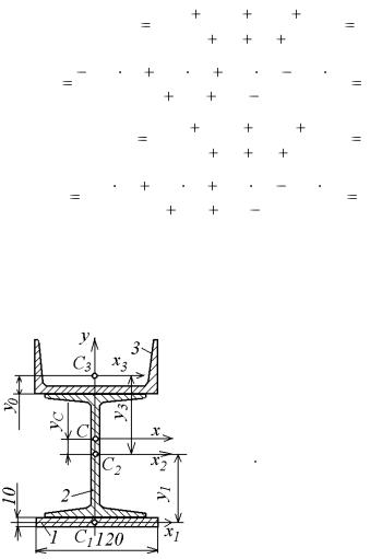 Пример 10.2. Определить положение центра тяжести симметричного сечения, показанного на рис. 10.4, состоящего из полосы размером 120 х 10 мм, двутавра № 12 (ГОСТ 823972) и швеллера № 14 (ГОСТ 8240-72).
