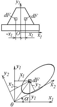 При повороте осей координат (рис. 10.8) координаты элемента площади dF будут изменяться, и соответственно будет изменяться величина центробежного момента. Если повернуть оси на 90°, координаты y1 и х1 поменяются местами по сравнению с начальным положением, а одна из координат (х1) изменит свой знак. Величина центробежного момента инерции при этом будет отличаться от первоначальной величины знаком. Так как при повороте осей центробежный момент инерции изменяется непрерывно, то должны существовать оси, для которых центробежный момент инерции обращается в нуль.
