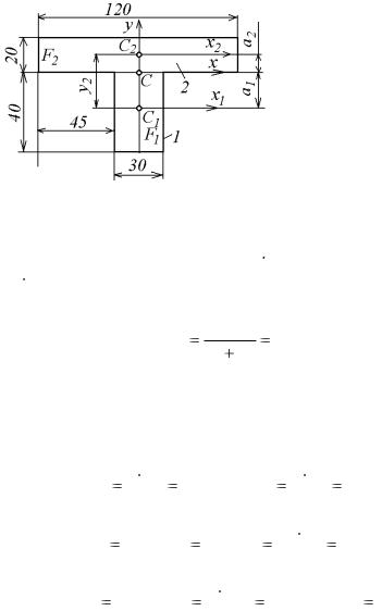 1. Определяем координаты центра масс. Для этого разбиваем сечение на два прямоугольника, проводим оси координат так, чтобы одна ось у совпала с осью симметрии (эта ось будет главной централь-