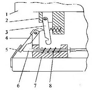 Система рычагов 1,2,3 и цилиндров 4,5,6 связывает между собой верхнюю и нижнюю плиты штампа. Ковш 7 соединен с рычагами центральным шарниром 6. При ходе ползуна вверх ковш 7 вводится в рабочую зону штампа. Деталь выталкивается из верхней половины штампа и падает в ковш. При опускании ползуна ковш вместе с деталью выносится из рабочей зоны.