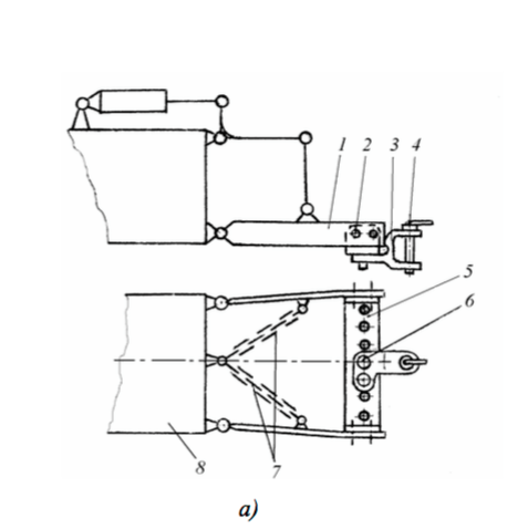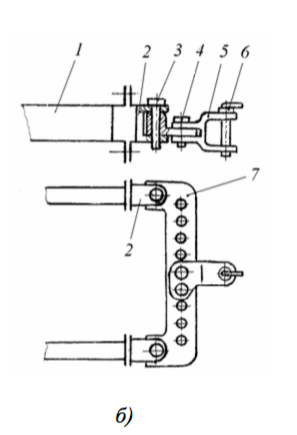 В тракторах ДТ-75М поперечина 7 с установленной на ней вилкой 5 через соединительные кронштейны 2 крепится к продольным лонжеронам 1 рамы трактора. Поперечина 7 несимметричной в вертикальной плоскости конфигурации соединяется с кронштейнами 2 через пальцы 3. Ее переворот на 180° обеспечивает необходимую регулировку точки прицепа по высоте. По ширине точка прицепа регулируется перестановкой вилки 5 по поперечине 7 и фиксацией пальцами 4.