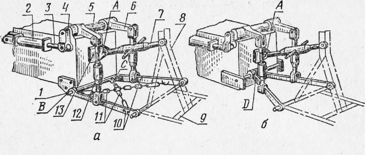 Схему навески называют двухточечной, если передние концы нижних тяг соединены вместе в шарнире Д (б) и машина опирается на остов трактора в двух точках А я Д.