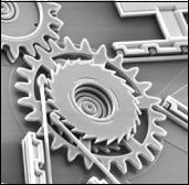 микроэлектроники. В конце технологического процесса изготовления микромашины все ее детали уже находятся на своих местах в правильном соединении между собой, но двигаться еще не могут, потому что как бы «утоплены» в толстом слое двуокиси кремния, которую необходимо вытравить кислотой. Толщина слоев поликремния 1–2 микрона, т. е. это – толщина шестерней, маховиков, шатунов, рычагов, собачек, храповиков, пружин и прочих составляющих механизма.