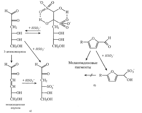 Неодинаковая роль сульфитов объясняется различиями в промежуточных продуктах реакции, участвующих в формировании окраски. Более всего подвержены влиянию сульфитов такие промежуточные продукты, как 3-дезоксизулозы и ненасыщенные озулозы. Первые образуют с сульфитом обратимые соединения и замедляют реакцию, вторые образуют необратимое добавочное соединение, в результате чего этот промежуточный продукт стабилизируется, а процесс потемнения задерживается до тех пор, пока сульфит не будет полностью использован. Эти дополнительные продукты были фактически выделены из модельных сред и идентифицированы в пищевых продуктах.