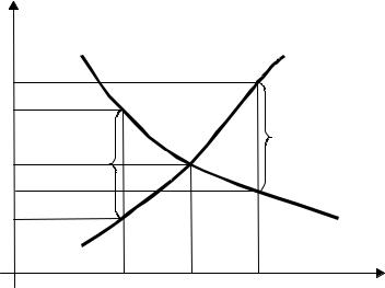 Изобразим путем совмещения на одном графике кривые спроса D и предложения S на определенный товар; при этом будем иметь в виду рыночный спрос и рыночное предложение, т.е. спрос и предложение всех участников рынка на данный товар (рис. 5.1)