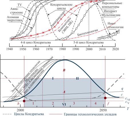 Рис. 1.1. Технологический уклад и цикл Н.Д. Кондратьева: стадии, фазы и зоны развития (~1995–2055 годы)
