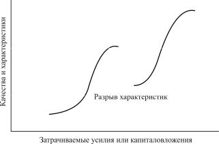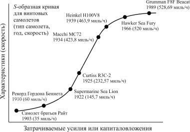 Приведенный пример роста скорости одномоторных винтовых самолетов демонстрирует одновременно две характерные особенности практически всех процессов, связанных с инновациями и коммерциализацией научных достижений. Речь идет о том, что параметры выходят на некоторые пределы, а при смене технологий наблюдается разрыв в непрерывных кривых развития. Легко понять, что в начальный период развития любой технологии (нижняя часть S-образной кривой) инвестиции связаны со значительным риском и неопределенностью, но зато