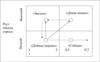 Пунктирная линия на матрице – это движение продукта на протяжении жизненного цикла, а непрерывная линия показывает направление инвестиций.