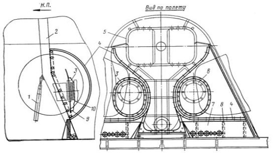 шпангоута № 1К; 6. Фланец кожуха привода двигателя; 7. Неподвижная панель; 8.