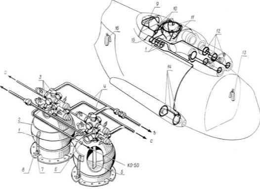 13. Передний переносной огнетушитель ОУ-2; 14. Распылители в отсеке КО-50; 15.