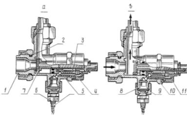 В верхней части корпуса имеется внутренняя резьба для установки цангового замка, а внутри корпуса - седло, на которое опирается клапан. Сбоку корпуса с одной стороны имеется рабочий штуцер для подсоединения коллектора системы пожаротушения, с другой стороны - два гнезда для установки пиропатронов.