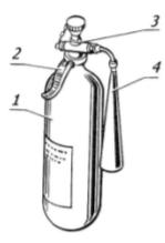 Рис.5 Огнетушитель переносной ОУ-2: 1. Баллон; 2. Ручка; 3. Кран; 4.