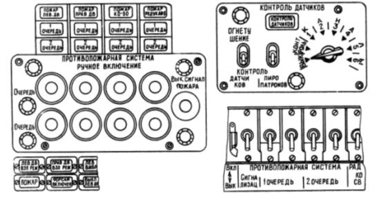 Четыре основных сигнальных табло установлены на щитке сигнализации на средней панели электропульта летчиков. Дополнительное табло «ПОЖАР» установлено на левой приборной доске.