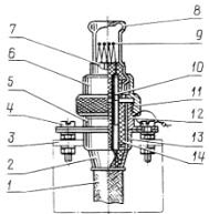 Термопара; 10. Контактный штырь; 11. Накидная гайка; 12. Штуцер; 13. Фланец;