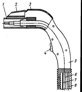 кнопка микропереключателя; 5 - рукоятка; 6 - трубка для подачи защитного газа;