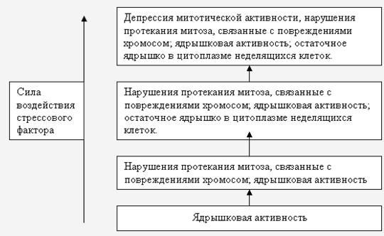 Исследования нарушений митоза и мейоза позволяют выявлять ранние изменения цитогенетической системы организма и прогнозировать ее состояние в меняющихся условиях. Применение ряда критериев цитогенетического мониторинга на одном тест-объекте расширяет пределы его чувствительности и позволяет уменьшить количество тест-систем и объектов для адекватной оценки влияния поллютантов ( Калаев В.Н., 2000 ). Необходимо выявить чувствительность различных цитогенетических показателей для создания шкалы критериев, по изменению которых можно оценивать силу воздействия загрязнителей на биообъекты.