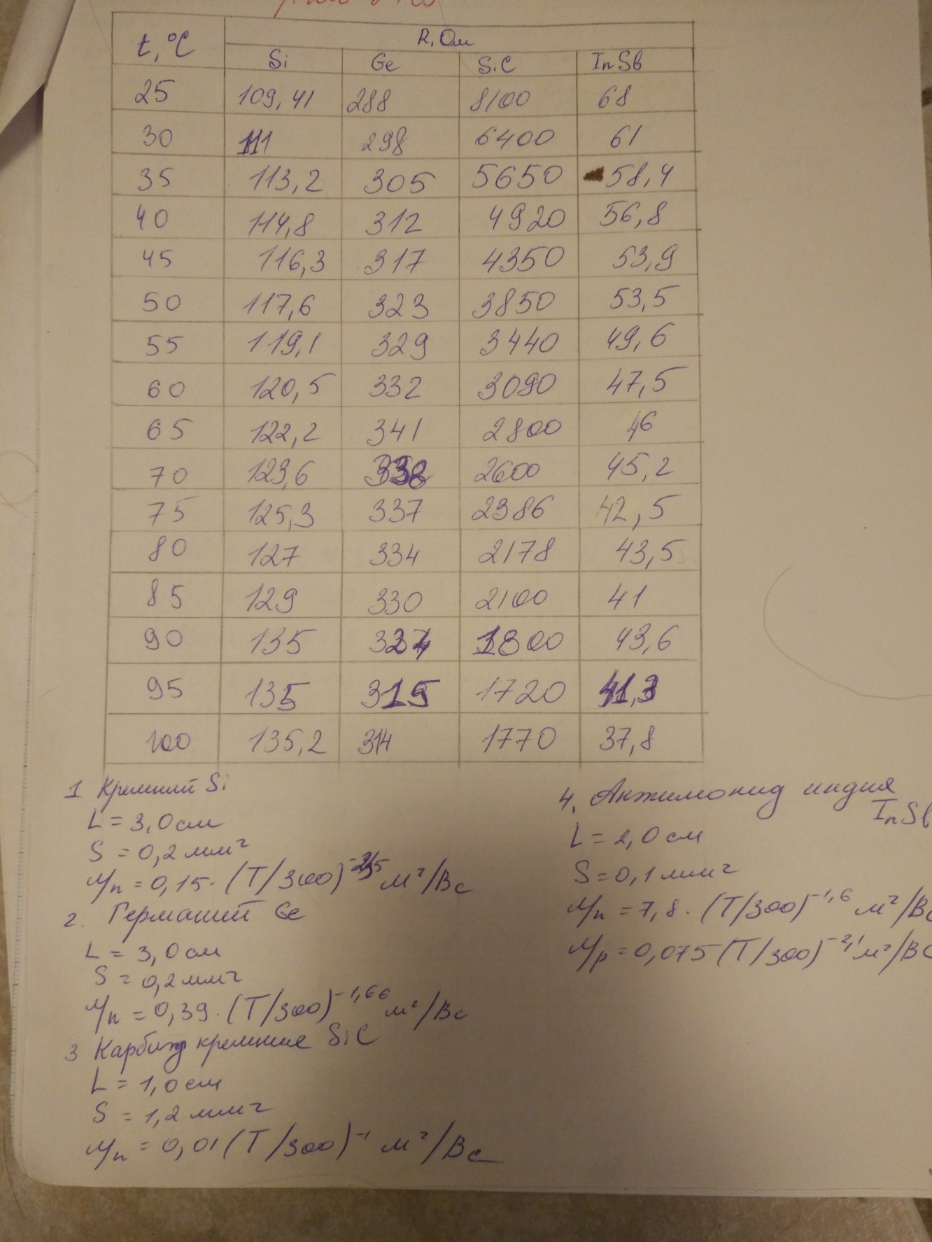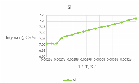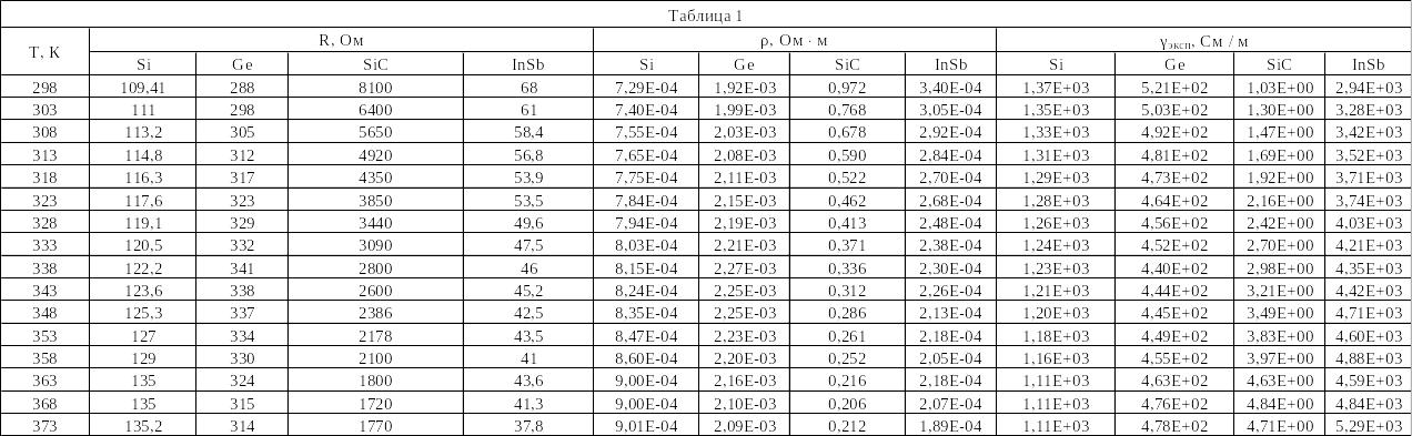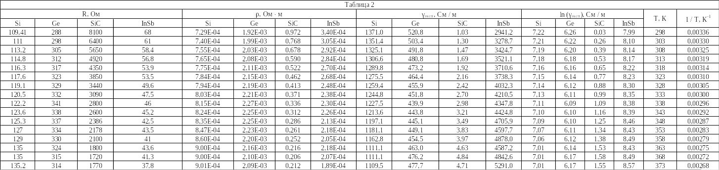 Рассчитать удельное сопротивление исследуемых полупроводниковых материалов для каждой температурной точки и соответствующие удельные проводимости образцов.