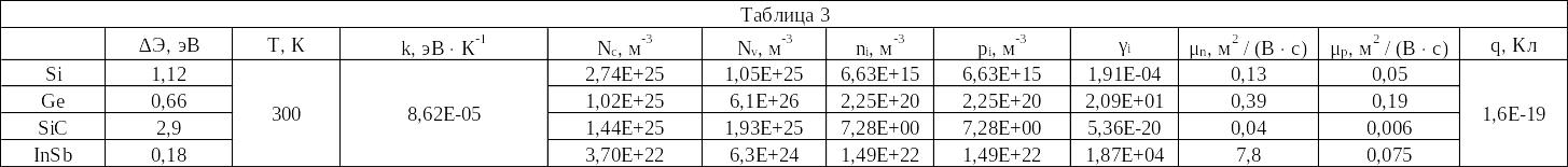 3 - 4) По данным табл. 3, рассчитать концентрации собственных носителей заряда в полупроводниках Si, Ge, InSb и SiC. Оценить значения собственной удельной проводимости в этих полупроводниках при T = 300 К.