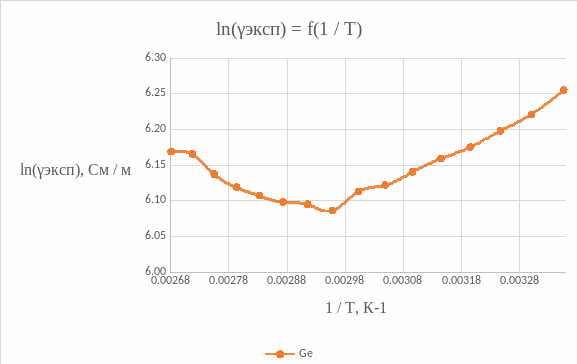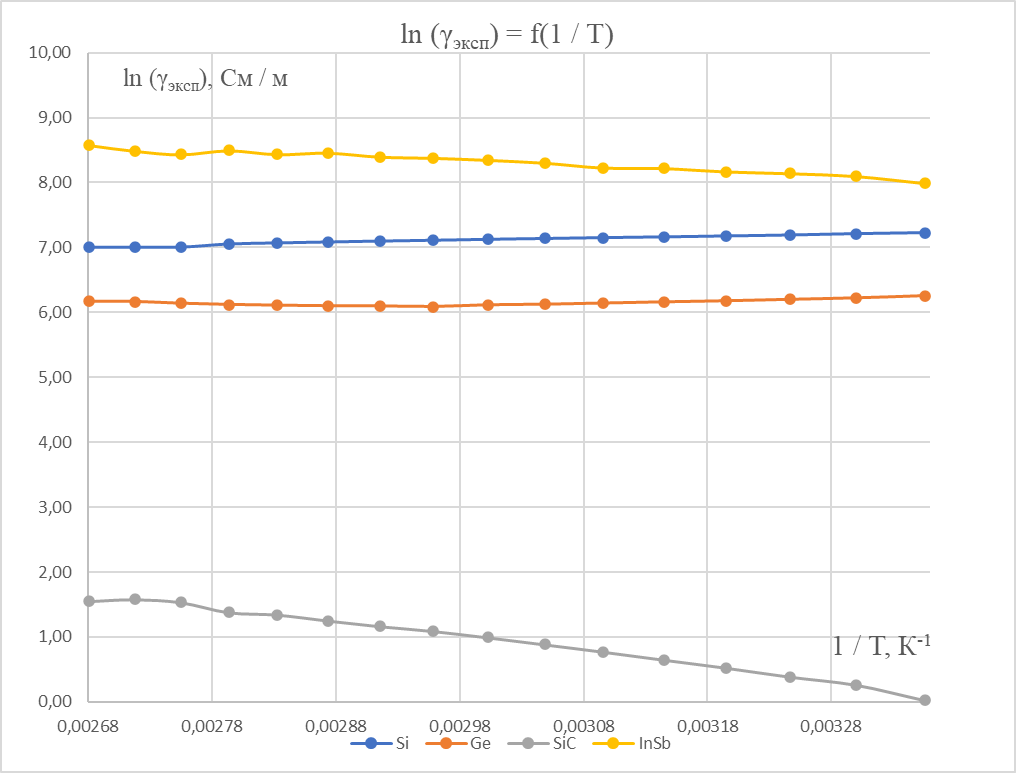 2) По данным табл. 2 построить температурные зависимости удельной проводимости полупроводников, откладывая по оси абсцисс параметр T−1, а по оси ординат – значения ln γэксп,. Графики ln γ=f(T−1) для всех исследованных полупроводниковых материалов привести на одном рисунке.