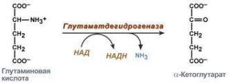 глутамат + NAD+ + H2O→ α-кетоглутароваякислота + NADH + H+ + NH4+