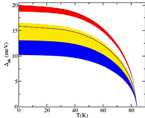 Рис. 5. Зависимость энергетических щелей сверхпроводящего металлического водорода при давлении 414 ГПа от температуры. Размазанные цветные области означают анизотропию энергетической щели, исчезающую в области Tc (см. пояснения в тексте).