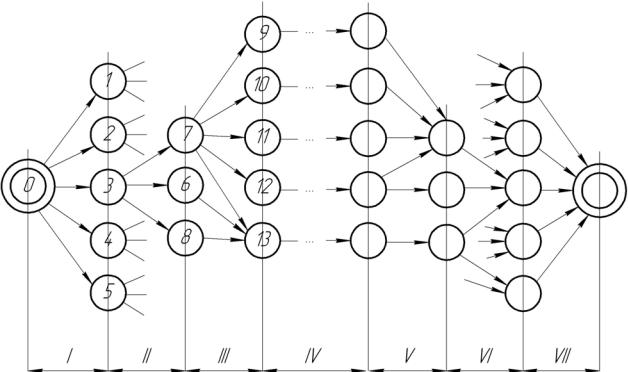 візка; VI – попередне складання рами візка; VII – опускання рами на колісно моторні блоки та остаточне складання візка. 0-13 – моменти закінчення та початку виконання робіт.