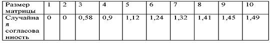 г) отношение согласованности (ОС) получим путем деления ИС на число, соответствующее случайной согласованности матрицы того же порядка.