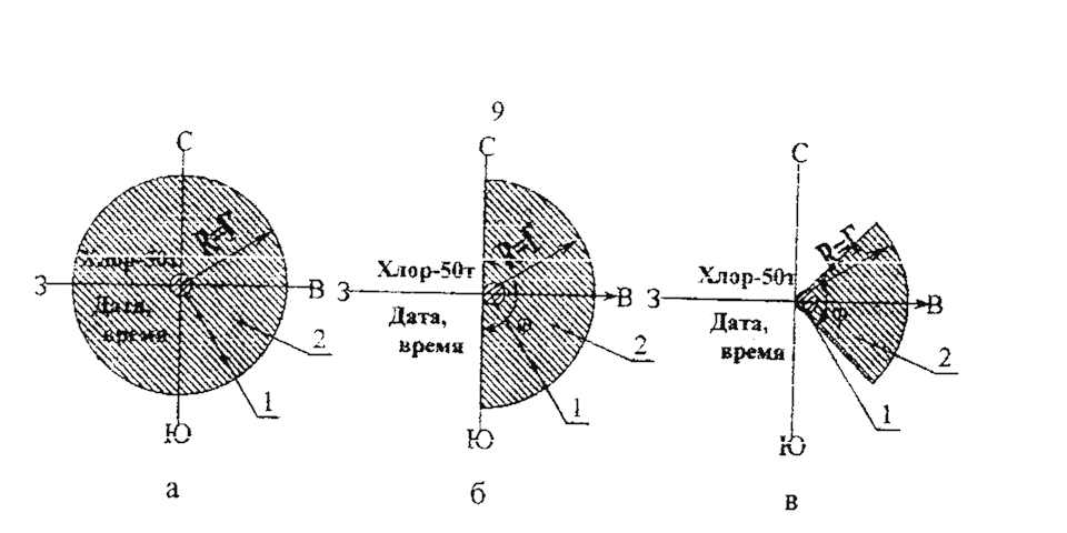 2 - территория, над которой распространились пары хлора в пороговой, поражающей и смертельной токсодозах;