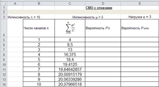. На рабочем листе MS Excel «СМО с отказами» выполняем следующие действия:
