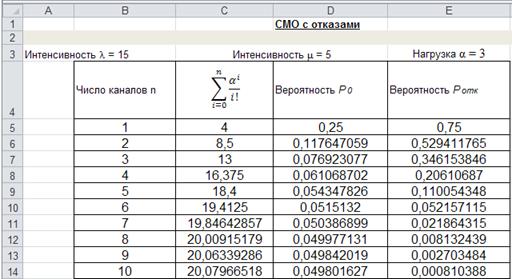 столбцы: Число каналов, Вероятность Р0, Вероятность Ротк, а также сумму