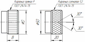 ГОСТ 21474–75 «Рифления прямые и сетчатые. Форма и основные размеры» устанавливает параметры рифлений в зависимости от диаметра и ширины накатываемой поверхности. Рифления условно изображают тонкими сплошными линиями, параллельными оси, если рифление прямое; если рифление сетчатое – то наклонными линиями в двух направлениях под углом (рис. 8, табл. 4).