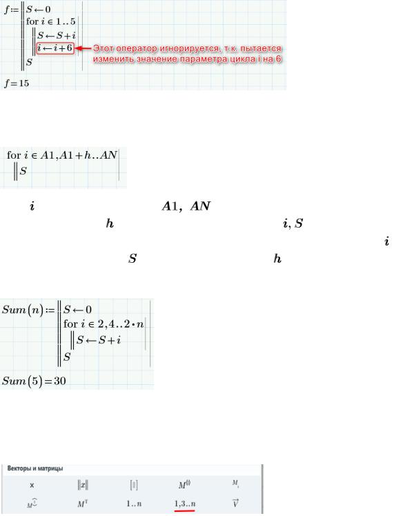 системой Mathcad Prime игнорируется (разумно!). Пример недопустимой организации цикла с параметром: