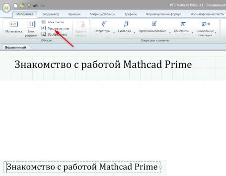 Создайте текстовую область, выбрав команду Текстовое поле в меню (рис. 1). Введите в Текстовую область тест: «Знакомство с работой Mathcad Prime». После ввода текста щелкните мышкой вне текстовой области, и рамка исчезнет.