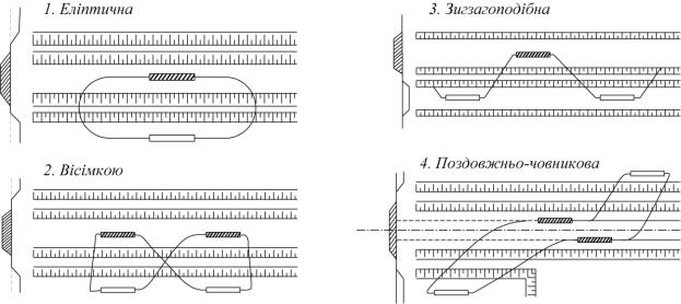 а – звичайна схема; б – гребінчаста схема; в – ребристо-шахова схема; г – клюквами.