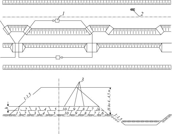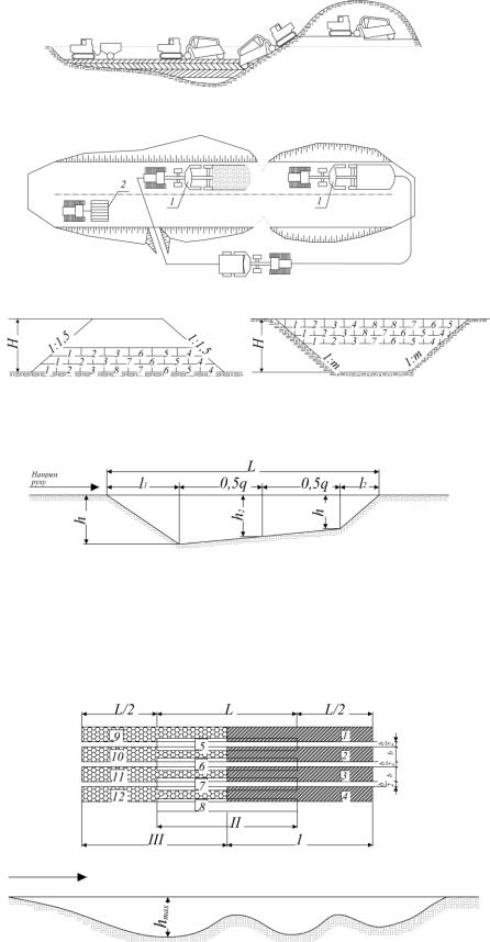 В’їзди та з’їзди на насипах і у виїмках при робочих відмітках 1,5…2 м влаштовують прямими, при більших висотах – косими. Вивантаження ґрунту здійснюється тільки на ходу при прямолінійному русі машин паралельними смугами вздовж насипу, який відсипається, починаючи від бровки до середини (рис. 4.2).