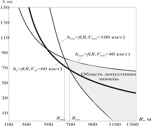 При такому підході до вибору радіуса пасажирські поїзди будуть проходити по кривій з реалізацією прискорення меншого, ніж допустиме 0,7 м/с2.