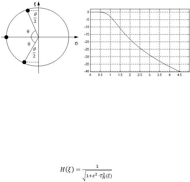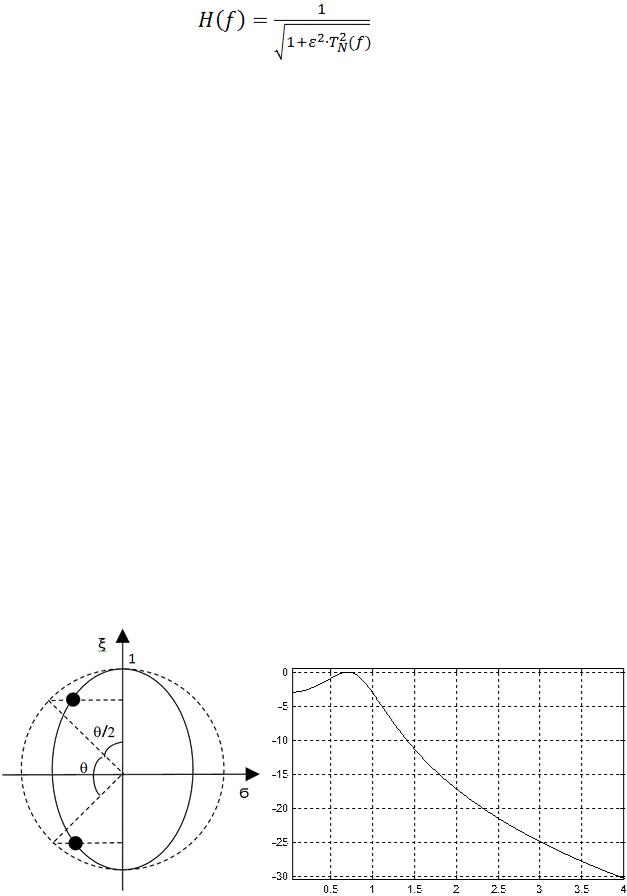 Подробный вывод положения полюсов аппроксимирующей функции фильтра Чебышева на s-плоскости приведен в [3]. Для нас важно то, что полюса фильтра Чебышева расположены на эллипсе, большая ось которого совпадает с осью нормированных частот. На этой оси эллипс проходит через точку частоты среза фильтра нижних частот.