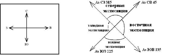Определить экспозицию склона по топографической карте сравнительно легко. На стандартных топографических картах ее верхняя рамка обращена на север, соответственно нижняя сторона – на юг, левая – на запад, правая – на восток (рис. 7А). Соответственно, склоны, имеющие наклон в сторону верхней границы рамки, будут иметь северную экспозицию, влево - западную и т.д. При этом склоном, например, северной экспозиции считаются не только склоны, ориентированные строго на север, но имеющие наклон в пределах сектора ограниченного азимутами СЗ 3150 – СВ 450. Аналогично обстоит дело со склонами южной, западной и восточной экспозиции (рис. 7Б).