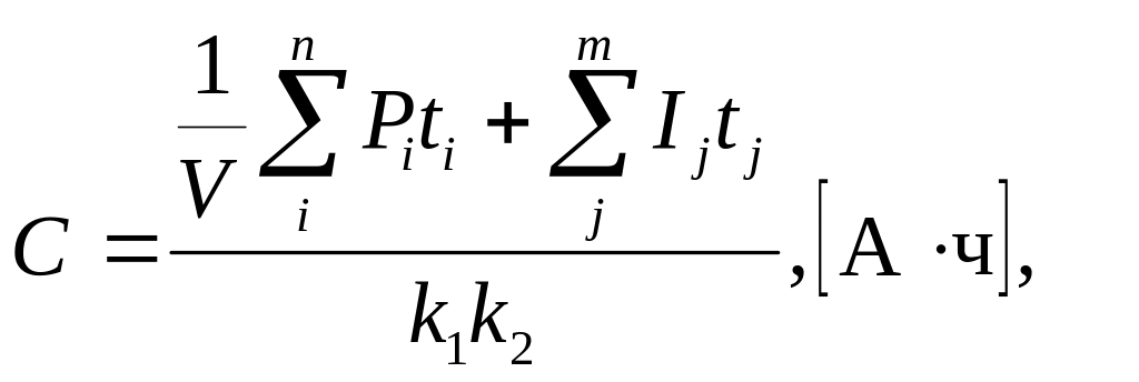 При выходе из строя аварийного дизель-генератора, в качестве аварийных источников тока используют аккумуляторные батареи. Тогда расчётную ёмкость батарей, необходимую для питания потребителей, определяют по формуле