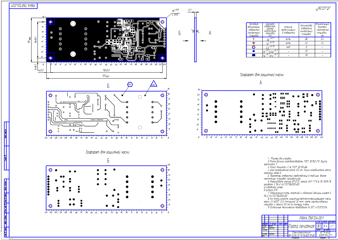 21. При автоматизированном и полуавтоматизированном способах выполнения чертежа печатной платы допускается в качестве второго и последующих листов использовать фотопленку в позитивном изображении с рисунком печатной платы; выполненном в масштабе 1:1. Размеры пленки определяются рисунком печатной платы. Этот лист чертежа выполняется без соблюдения требований ГОСТ 2.301 и ГОСТ 2.104 с указанием на поле, свободном от печатного рисунка, обозначения чертежа, порядкового номера листа и инвентарного номера подлинника. Прочие данные, необходимые для изготовления печатной платы следует помещать на первом листе чертежа.