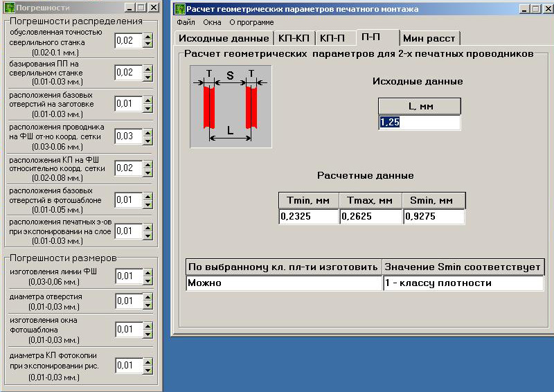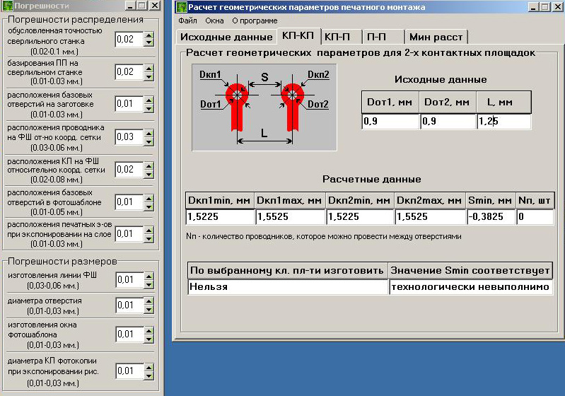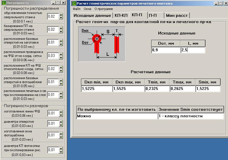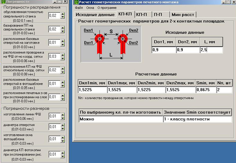 Из представленных на рис. 1.7 расчетов видно, что плотность монтажа (кп-п) соответствует 3-му классу точности, что не удовлетворяет заданным параметрам. При выбранном расстоянии между контактной площадкой и проводником плату можно изготовить по 1-му классу точности. Расчет представлен на рис. 1.8.