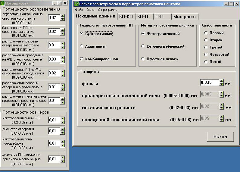 Из представленных на рис. 1.9 расчетов видно, что изготовить плату по 3-му классу точности с заданным расстоянием между проводниками можно, но процесс изготовления будет достаточно трудоемким.