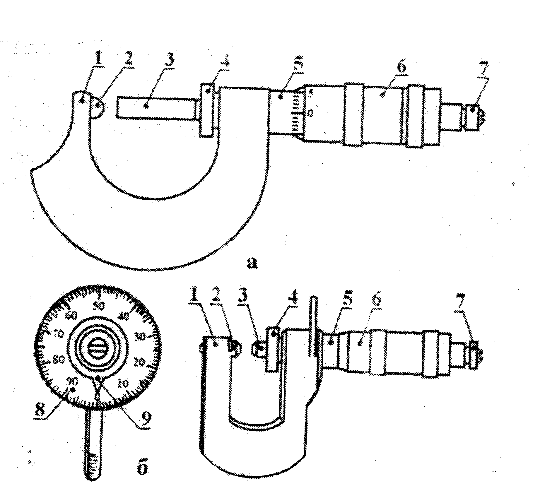 В скобу 1 микрометра, запрессованы пятка 2 и стебель 5. Микрометрический винт 4 ввинчивается в микрогайку 7. Гладкое отверстие стебля обеспечивает точное направление микровинта. Резьба микрогайки выполнена на её разрезанном конце. На эту резьбу навинчивают регулировочную гайку 8, которой стягивают микровинт до тех пор, пока микровинт не будет перемещаться в ней без зазора. На микровинт надевается барабан 6, закрепляемый установочным колпачком 9.