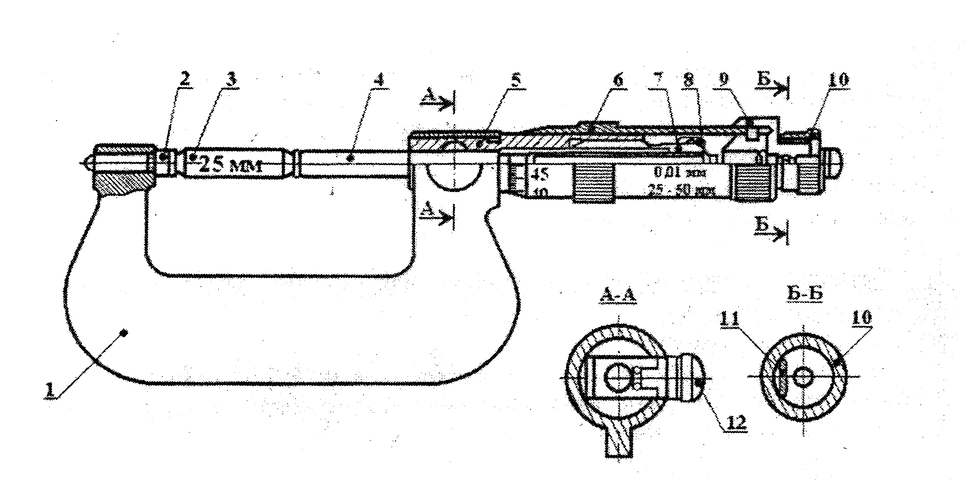 В последнем просверлено глухое отверстие для пружины и зуба 11, упирающегося в трещетку 10. При вращении трещетки она передает крутящий момент определенной величины, необходимой для обеспечения измерительного усилия равного 7 ±2 Н. Стопорное устройство используют, если необходимо сохранять микрометрический винт в установленном положен. Микрометры изготавливают со следующими пределами измерения: 0-25; 25-50; 50-75; 75-100; 100-125; 125-150; 150-175; 175-200; 200-225; 225-250; 250-275; 275-300; 300-400; 400-500.