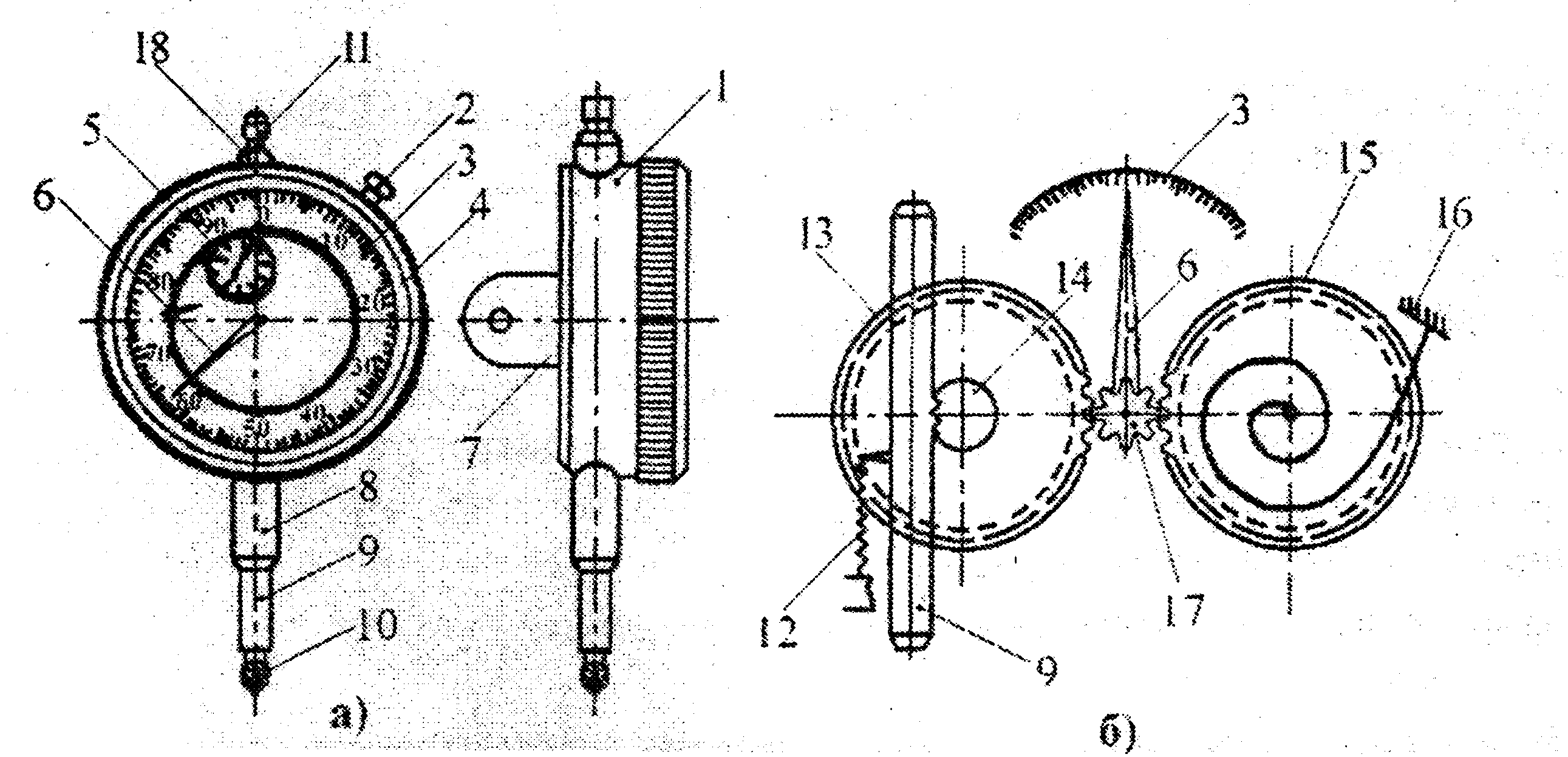 На оси этого колеса неподвижно закреплена стрелка 6. линейное перемещение измерительного стержня 9 вызывает поворот зубчатых колес 14 и15. Зубчатое колесо 13 вращает колесо 17 и стрелку индикатора 6.
