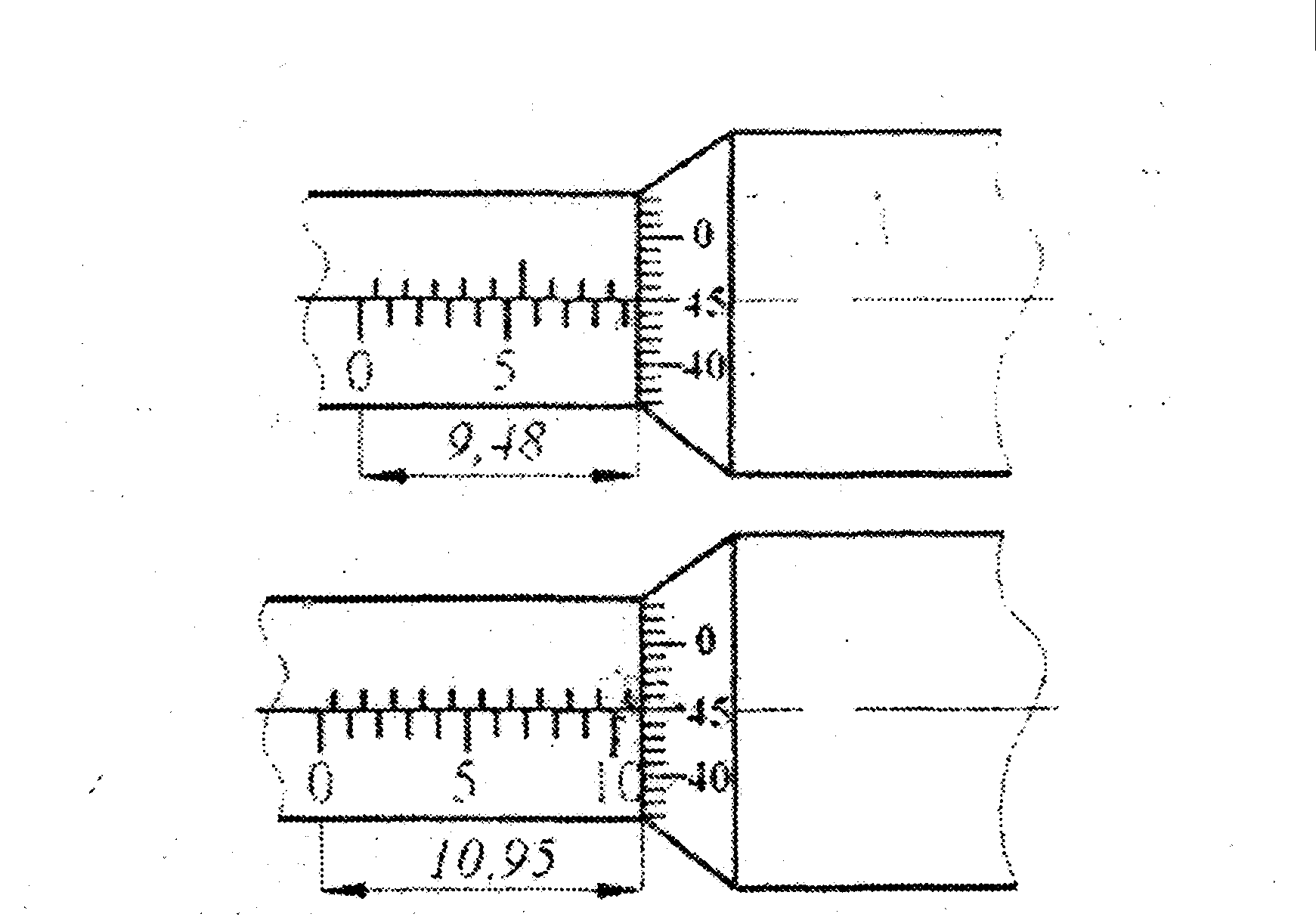 По продольной шкале отсчитывают целые доли миллиметра (по нижней части шкалы) и 0,5 мм (по верхней части шкалы). По круговой шкале отсчитывают десятые и сотые доли миллиметра.