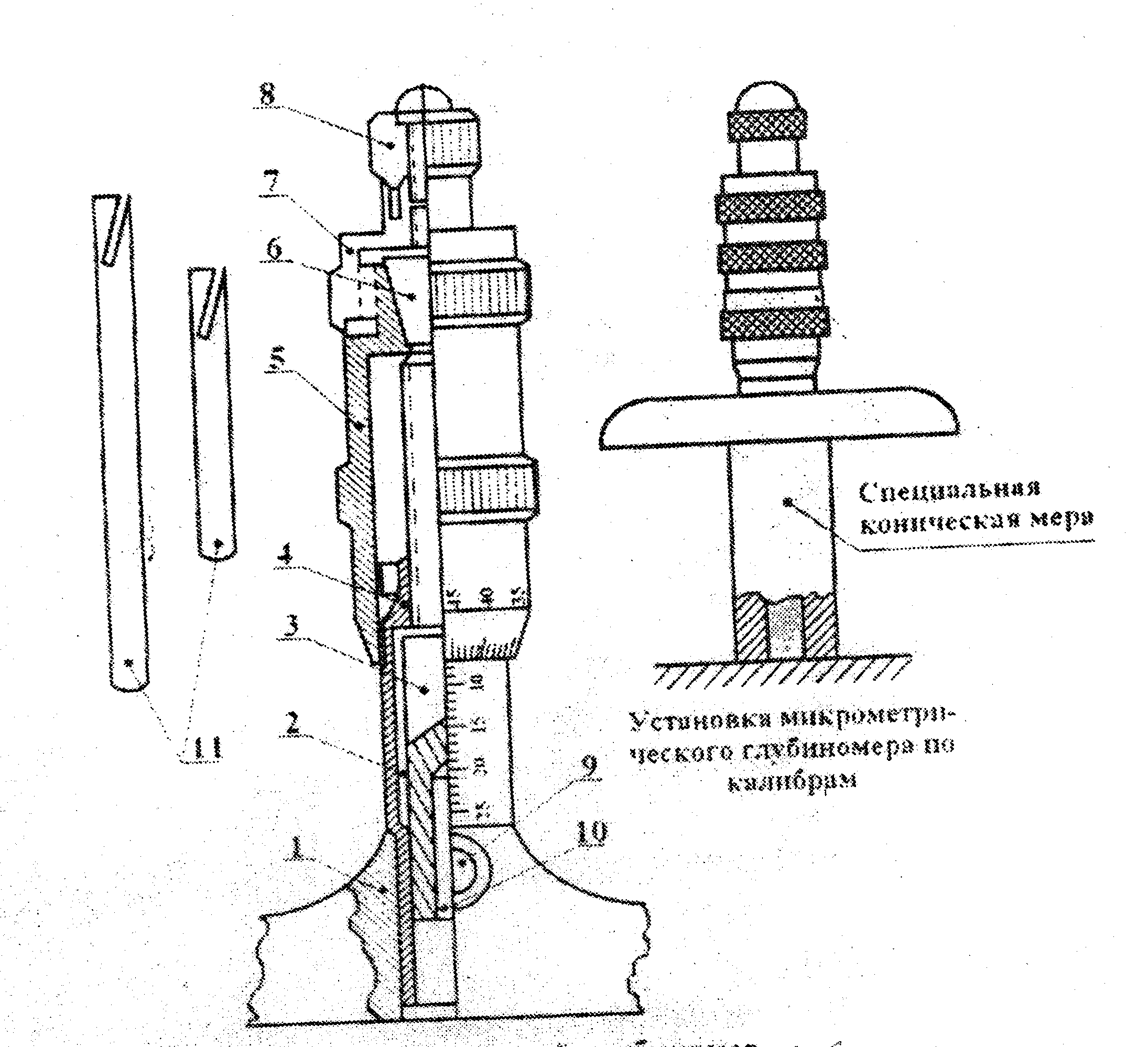 У глубиномеров стебель жестко соединен с основанием 1. Одной из измерительных поверхностей является нижняя плоскость основания 1. Второй измерительной поверхностью является поверхность сменного измерительного стержня 10. Микрометрическая головка аналогична головкам микрометров. В отверстие 10 вставляют сменные стержни 11, имеющие пружинящее устройство для обеспечения плотной посадки в отверстии 10.